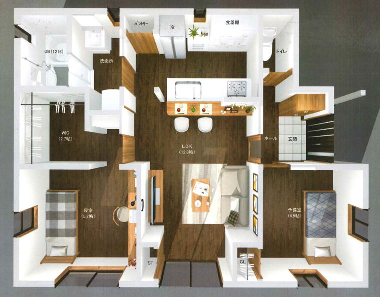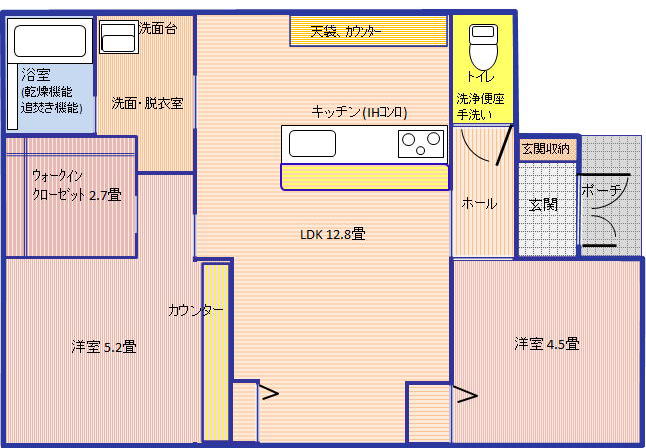 2LDK タイプ ・洋室4.5畳 ・洋室5.2畳 ・ウォークインクローゼット 2.7畳 ・LDK 12.8畳 ・バス トイレ |